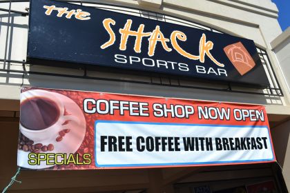 The Shack has a relaxed atmosphere with a sublte African decor. There is seating for approximately 50 people inside the shop where patrons are totally removed from the hectic pace of the plaza/parking lot. There is also outside "sidewalk" seating for about 20 customers who enjoy people-watching. The Shack features a daily breakfast special which includes a full English breakfast with free coffee. The shop has a full lunch menu as well.